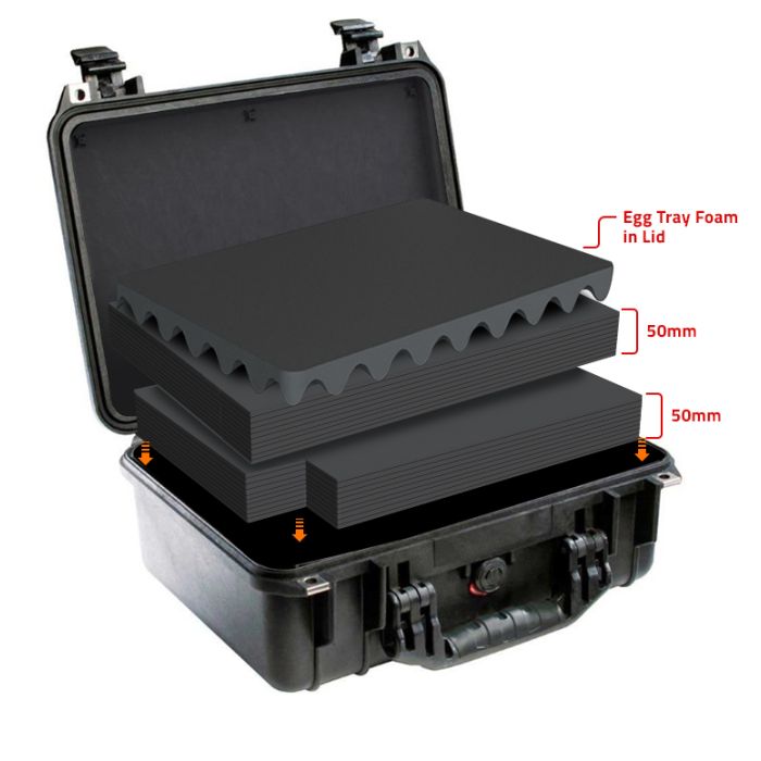 Peli 1450 Case med multilayer skum. Multilayer Foam er en PE specialskum der er præ-lamineret i lag og kan nemt skæres og formes, så det passer til præcist til dit udstyr. Glemt alt om besværligt plukskum eller blødt skum du ikke kan skære i. Med multilayer foam får du en mellemhård skumtype, du hurtigt tilpasse til din riffel og udstyr, ved at skære rundt om dit udstyr og helt simpelt skrælle skummet i den dybde du ønsker. Leveres med 3-Lag skum (2 x 50 mm MLF + 1 x 5 mm og æggebakkeskum i låg.