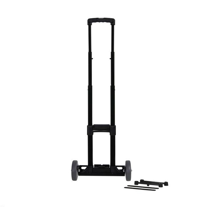 Three-stage extendable handle with locking button on handle. Tubes made of black aluminium, handle and mounting plates of plastic. The ball-bearing mounted wheels are fastened to a sturdy frame made of black powder-coated steel. The trolley is very easy to steer by the handle thanks to the large wheels and wide wheelbase. The handle clips into two included plastic brackets on the case.